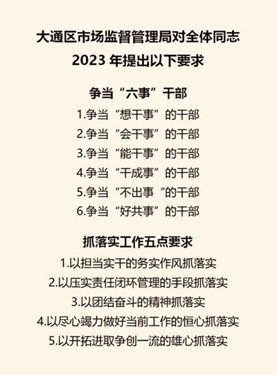 为深入贯彻党的二十大精神,深化“一改两为”推动高质量发展,树立市场监管形象,激发广大市场监管干部职工创业干事信心和决心,近日,最佳娱乐365bet_beat365体育亚洲网页版_365bet会员登录市场监督管理局对全体干部职工提出抓工作落实、争当“六事”干部的新要求。